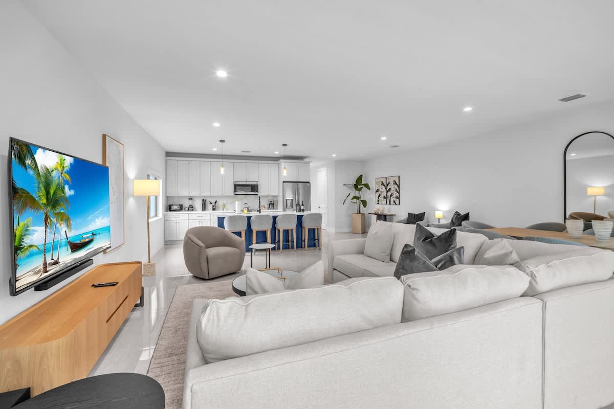 Living Areas: The open living room features a cozy sectional, great for movie nights or relaxing together. The bright layout flows into the dining area, a perfect spot for meals and conversations.