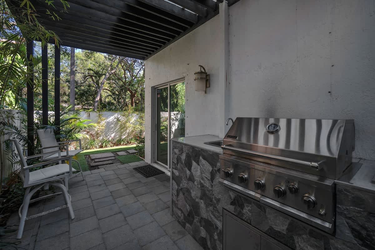 Your own private side yard awaits for alfresco dining, morning yoga, or unwinding with a glass of wine. It’s the perfect spot to soak up Miami's sunshine and relax in a tranquil setting. Wrapping around the side yard to the back terrace with pergola. a full outdoor kitchen awaits and is ready to be put to use to grill and BBQ away.