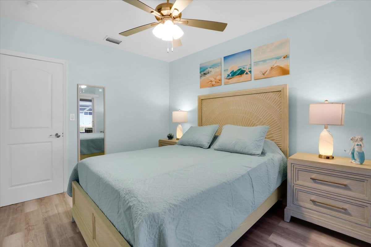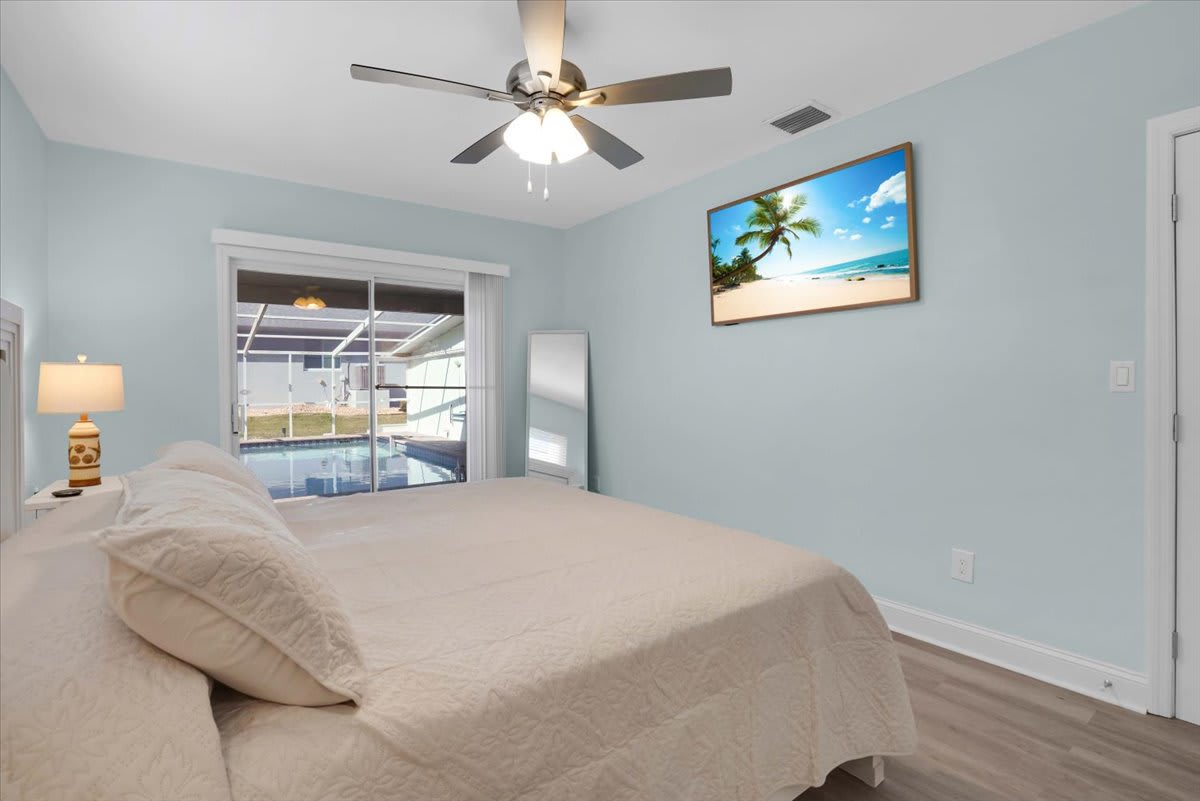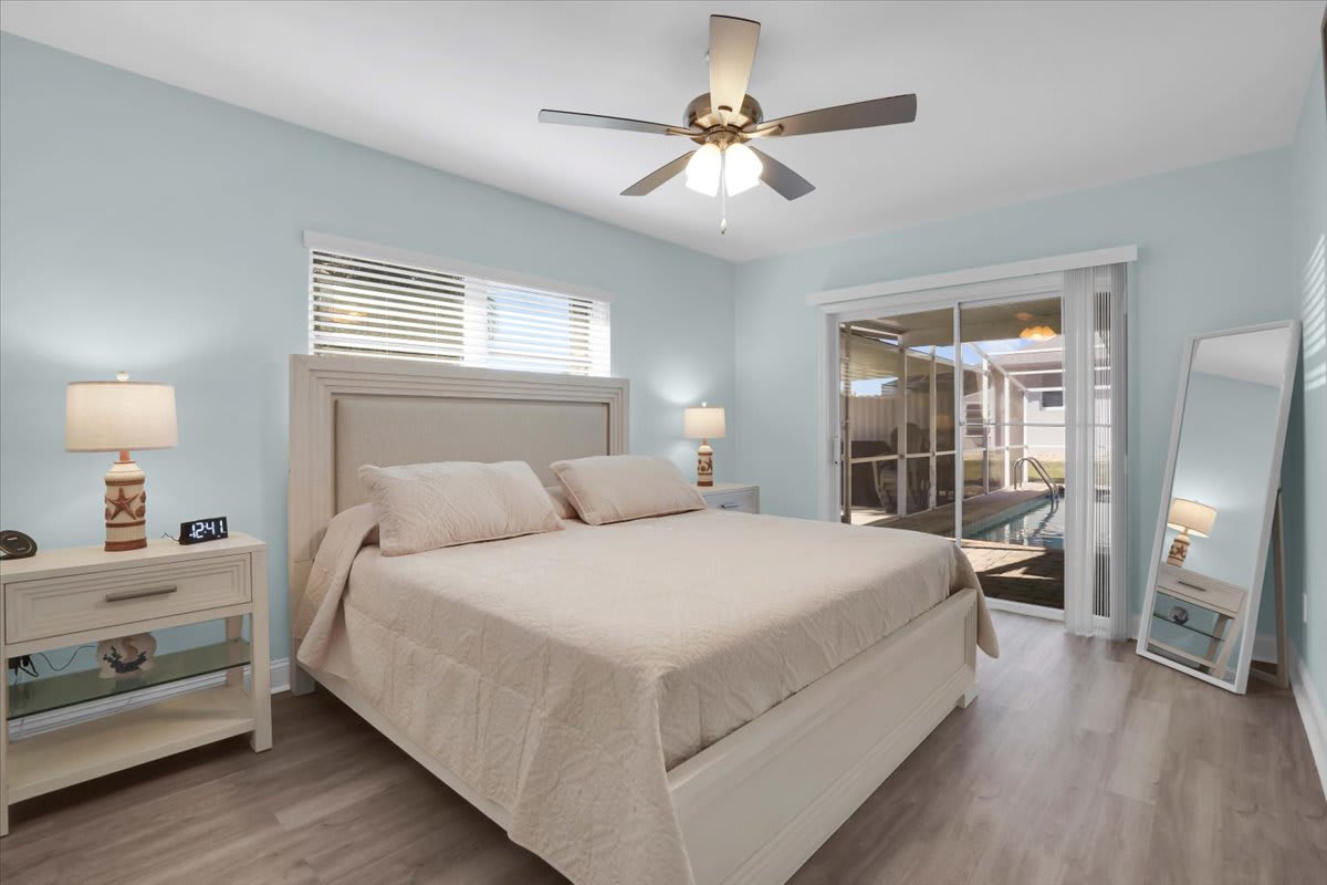 • Primary Bedroom: King bed, ensuite bathroom, direct pool & lanai access