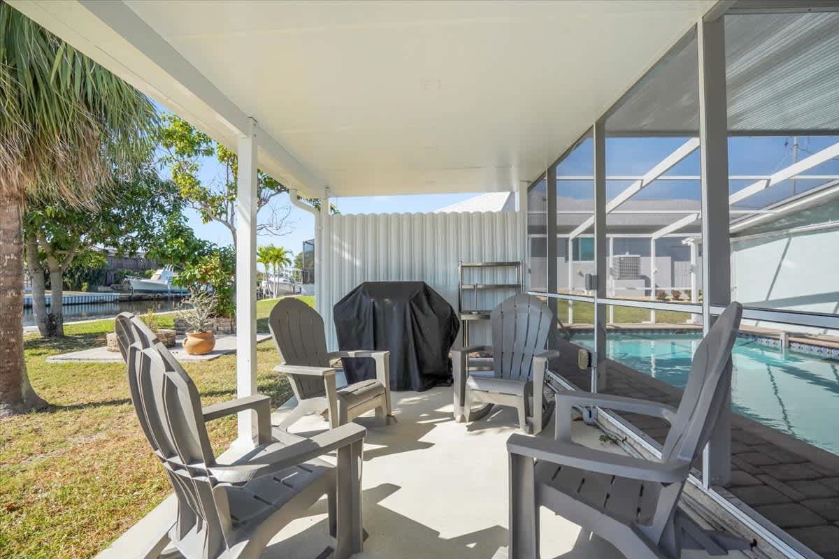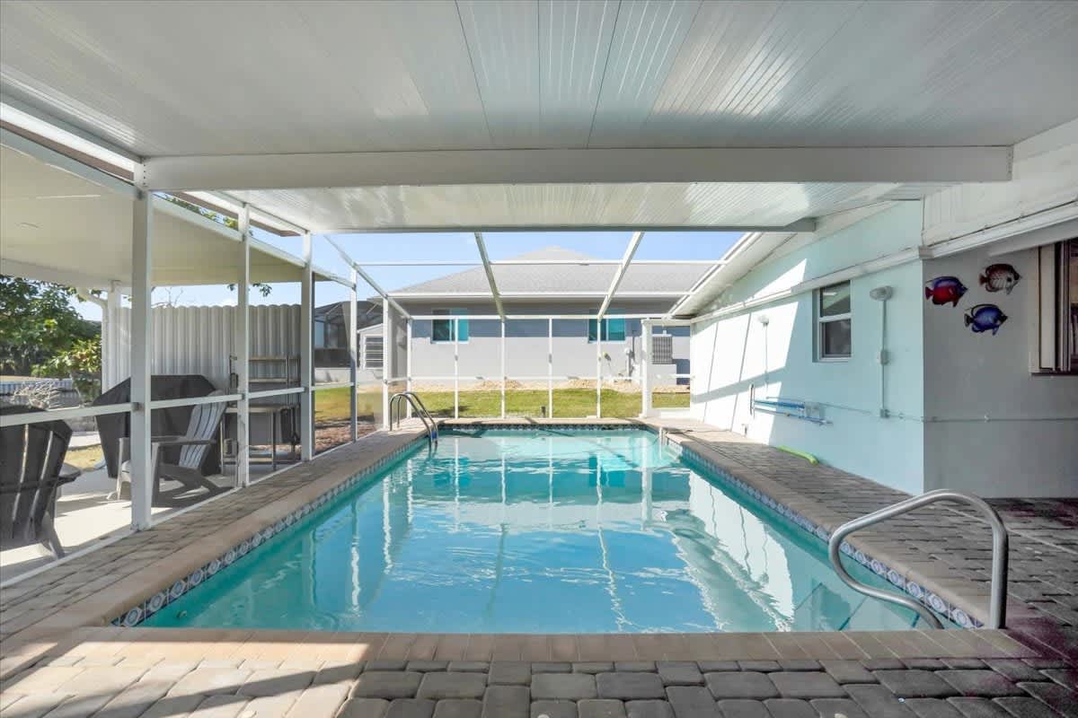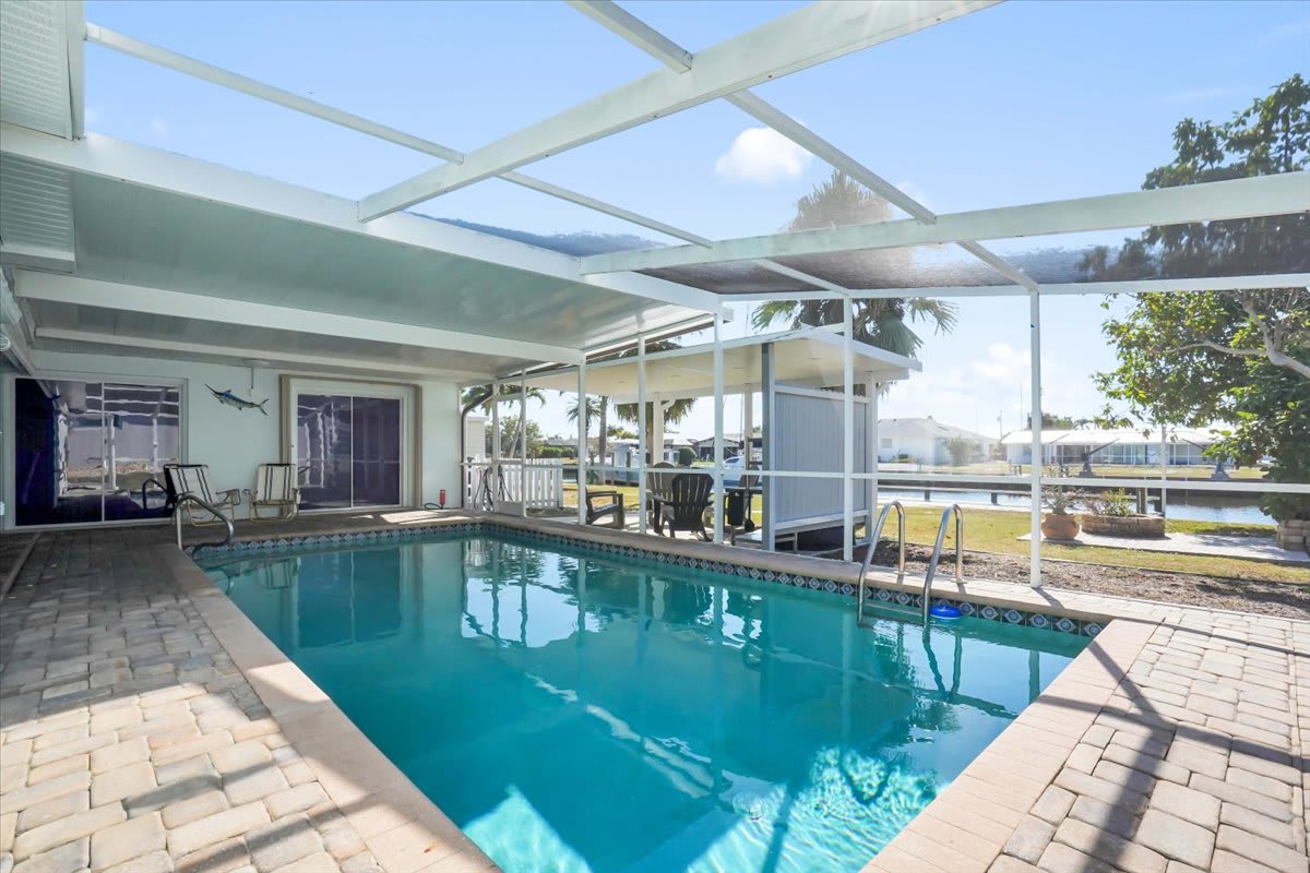 Step outside to your private screened-in lanai featuring a heated pool, outdoor seating, and tranquil canal views. The backyard is perfect for sunbathing, swimming, or unwinding after a day on the water.