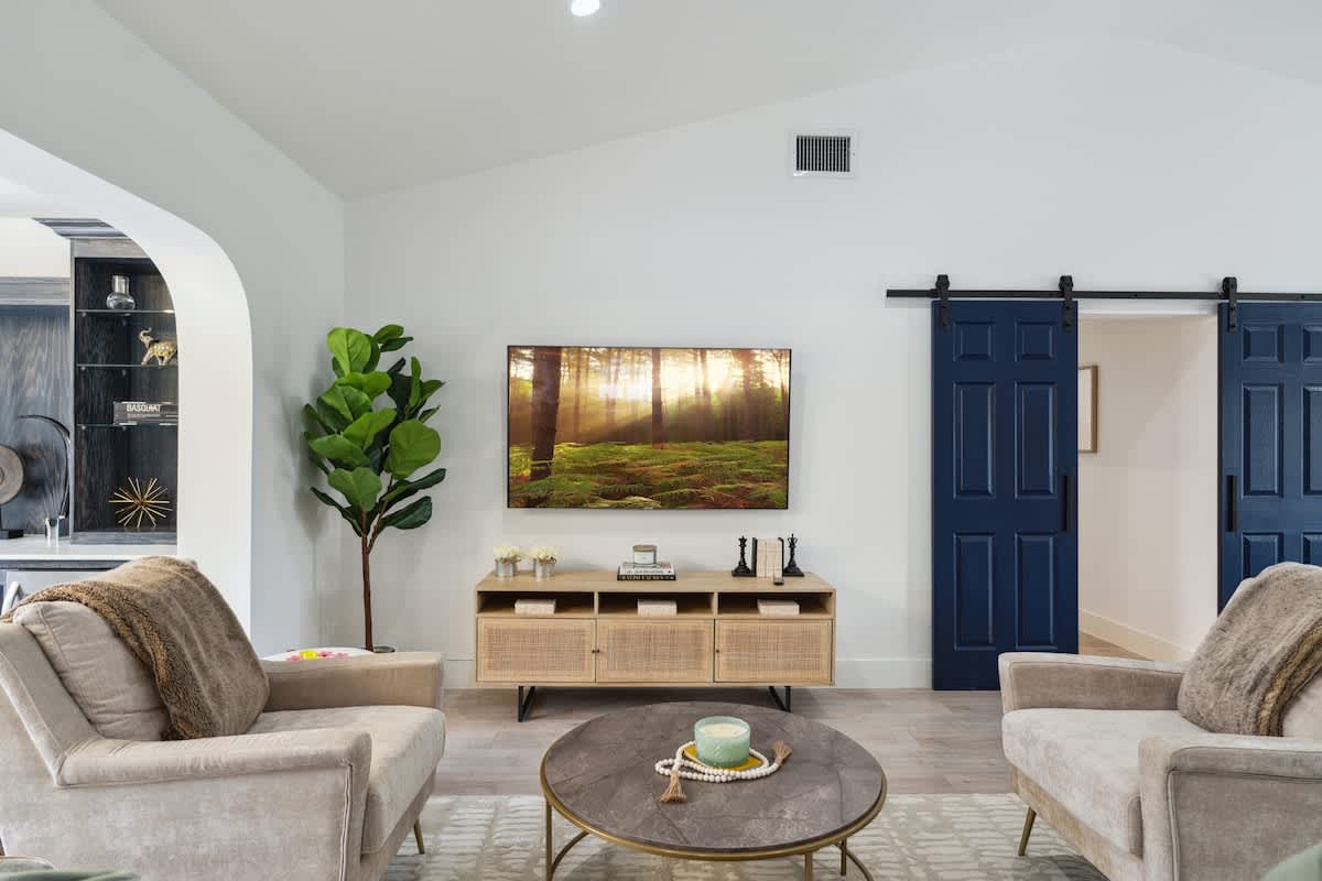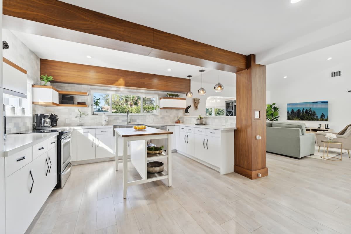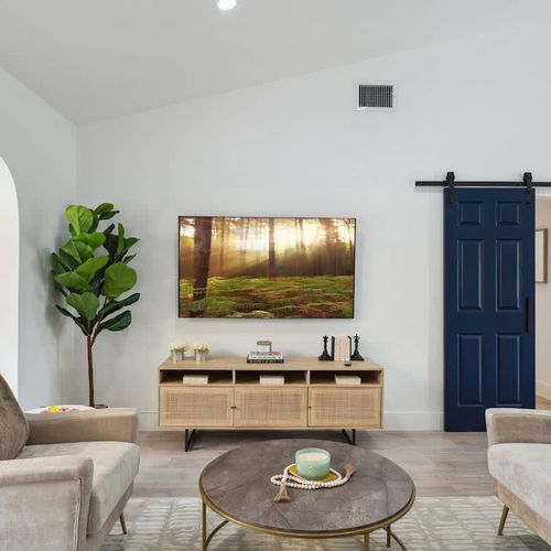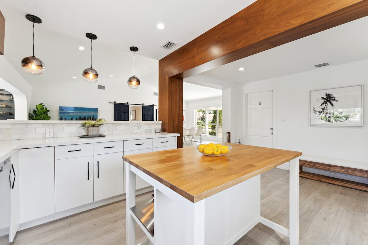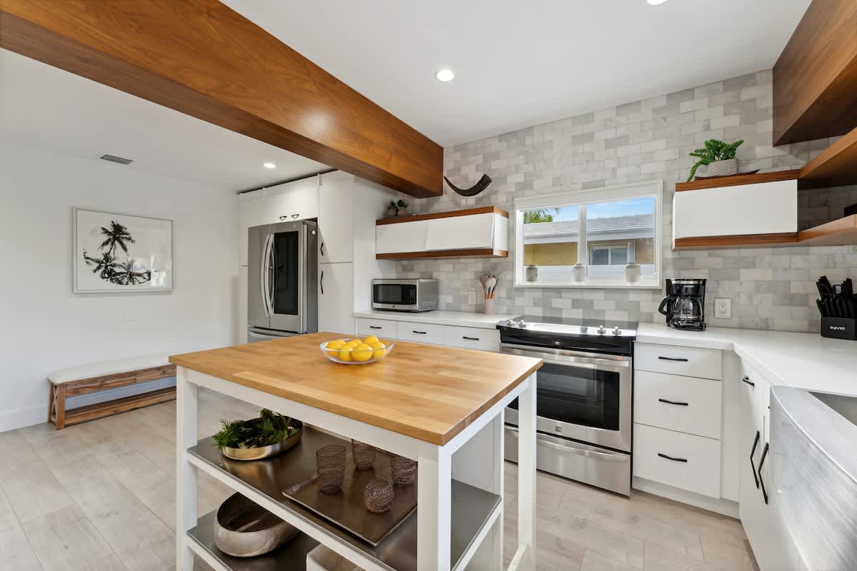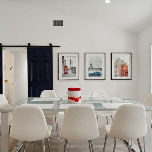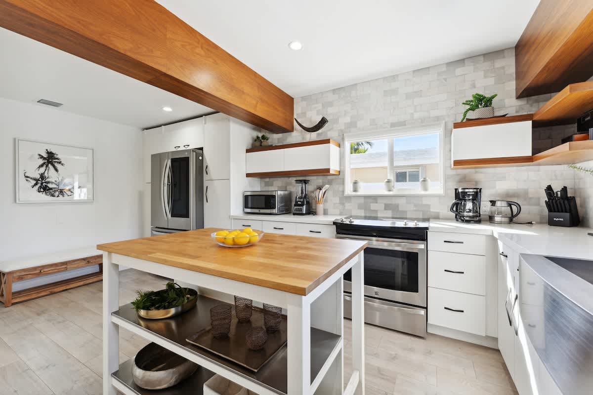 Step into a serene and stylish interior, where calming colors and modern finishes create a peaceful escape from the everyday. The open-concept living and dining area is perfect for group gatherings, movie nights, or simply lounging after a day at the beach. Our fully stocked kitchen has everything you need to prepare meals and enjoy time together.