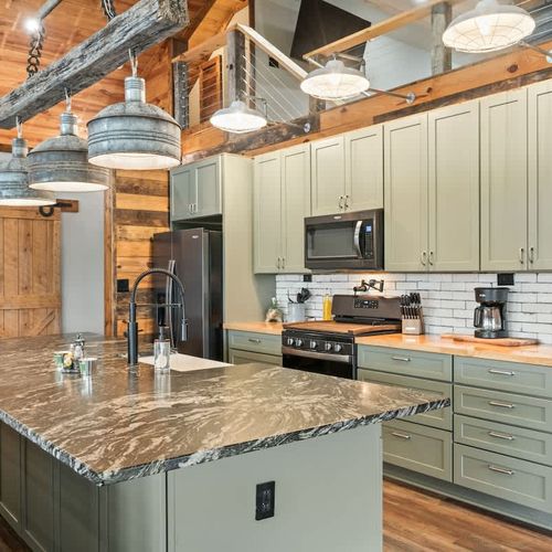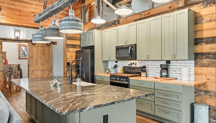 Swansa Farm features an open-concept layout that blends rustic farmhouse charm with modern comfort. The main living area includes a beautifully updated kitchen with ample counter space and a seamless flow into a large dining area, where guests can enjoy meals with serene views of the surrounding hills.