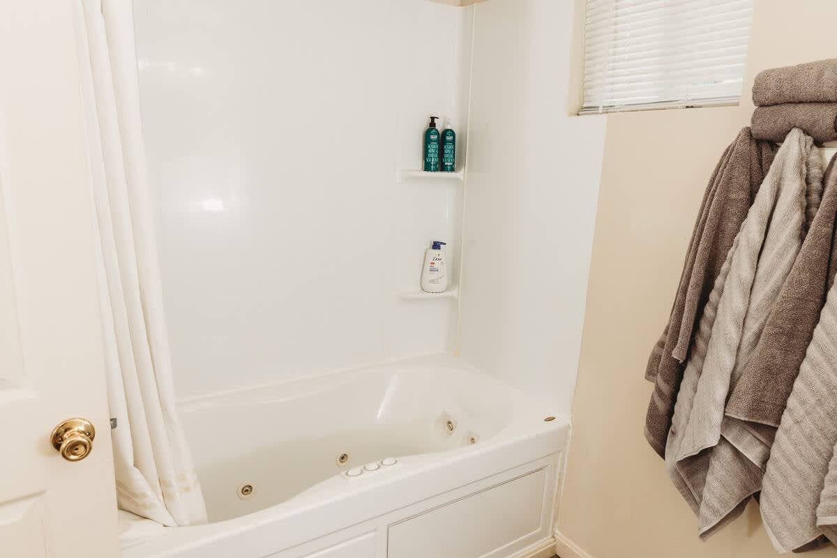 The master bedroom serves as a peaceful workspace, furnished with a comfortable queen bed and a desk for those balancing work and leisure. The second bedroom offers two twin beds with generous space, ideal for family or friends. A well-appointed full bathroom, featuring a luxurious jetted tub, serves both bedrooms.