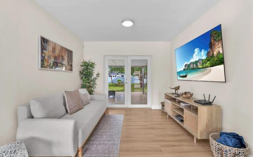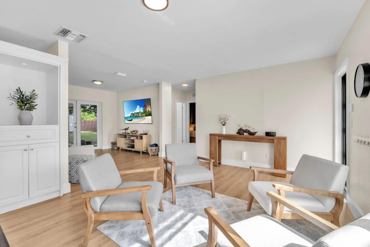 Bright and welcoming living room with comfortable seating, strong WiFi, and a fresh, modern design, perfect for family time, movie nights, or remote work.